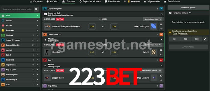 O 223Bet oferece uma grande seleção de opções de apostas em e-sports com probabilidades competitivas